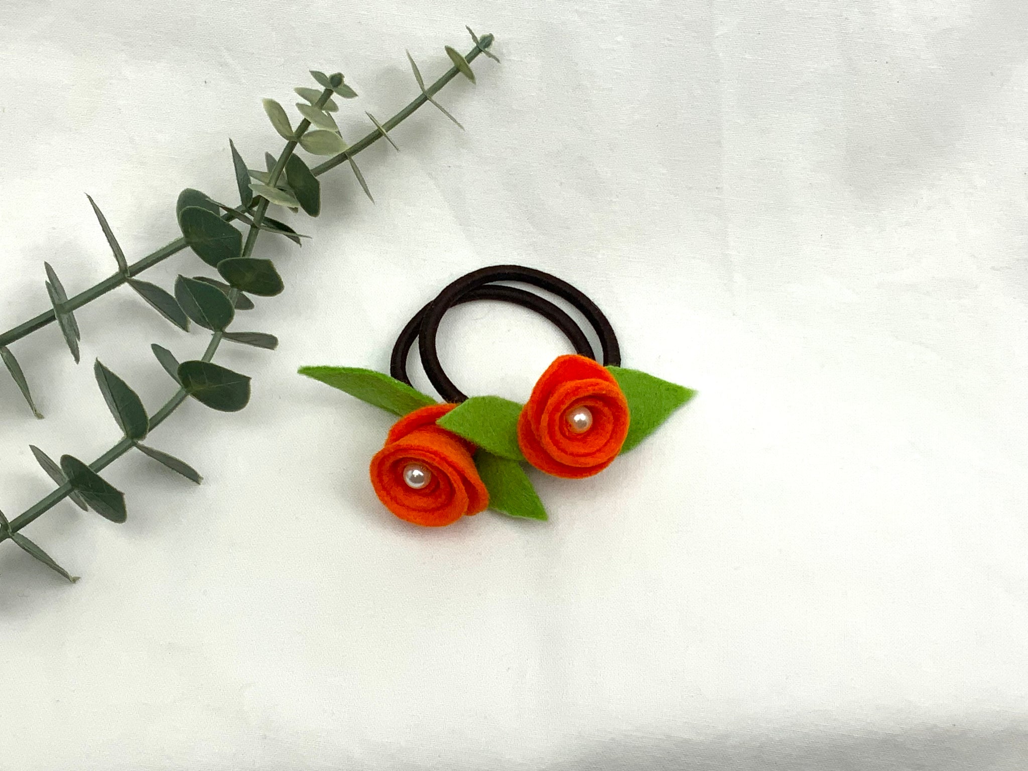 Handmade children's hair bands. Felt roses with a centre pearl bead, hand sewn onto the elastic. No glue used. Orange felt rose on a brown elastic band. Best suited for darker coloured hair.