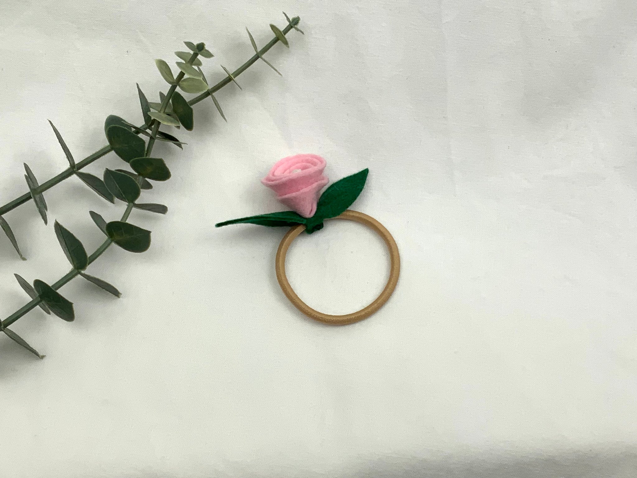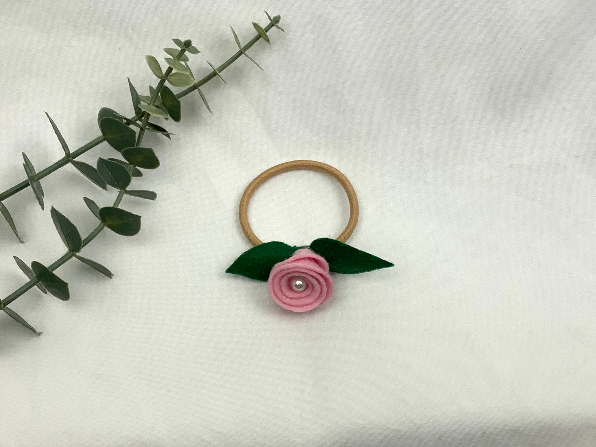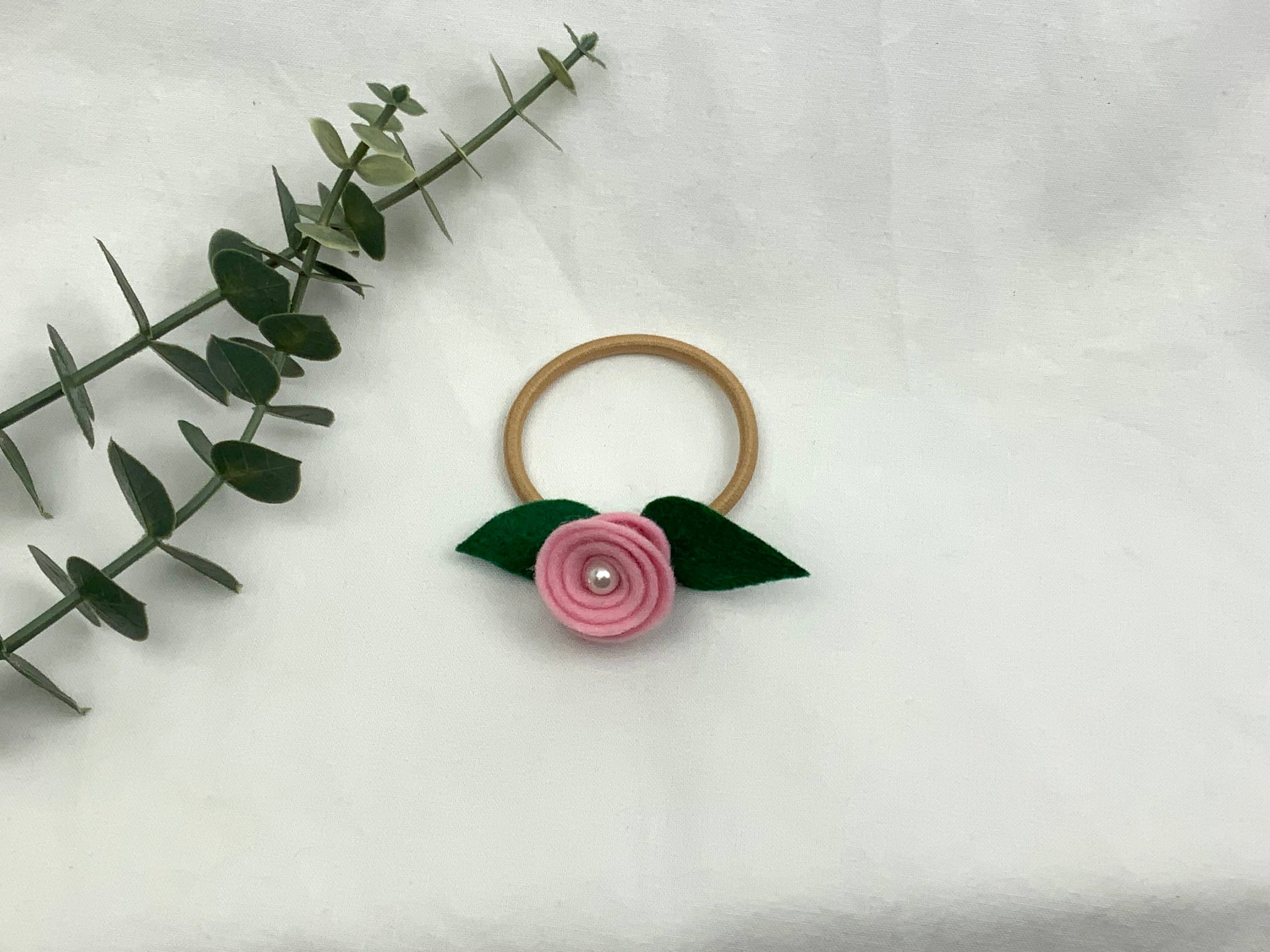 Handmade children's hair bands. Felt roses with a centre pearl bead, hand sewn onto the elastic. No glue used. Pastel Pink felt rose on a blonde elastic band. Best suited for lighter coloured hair.