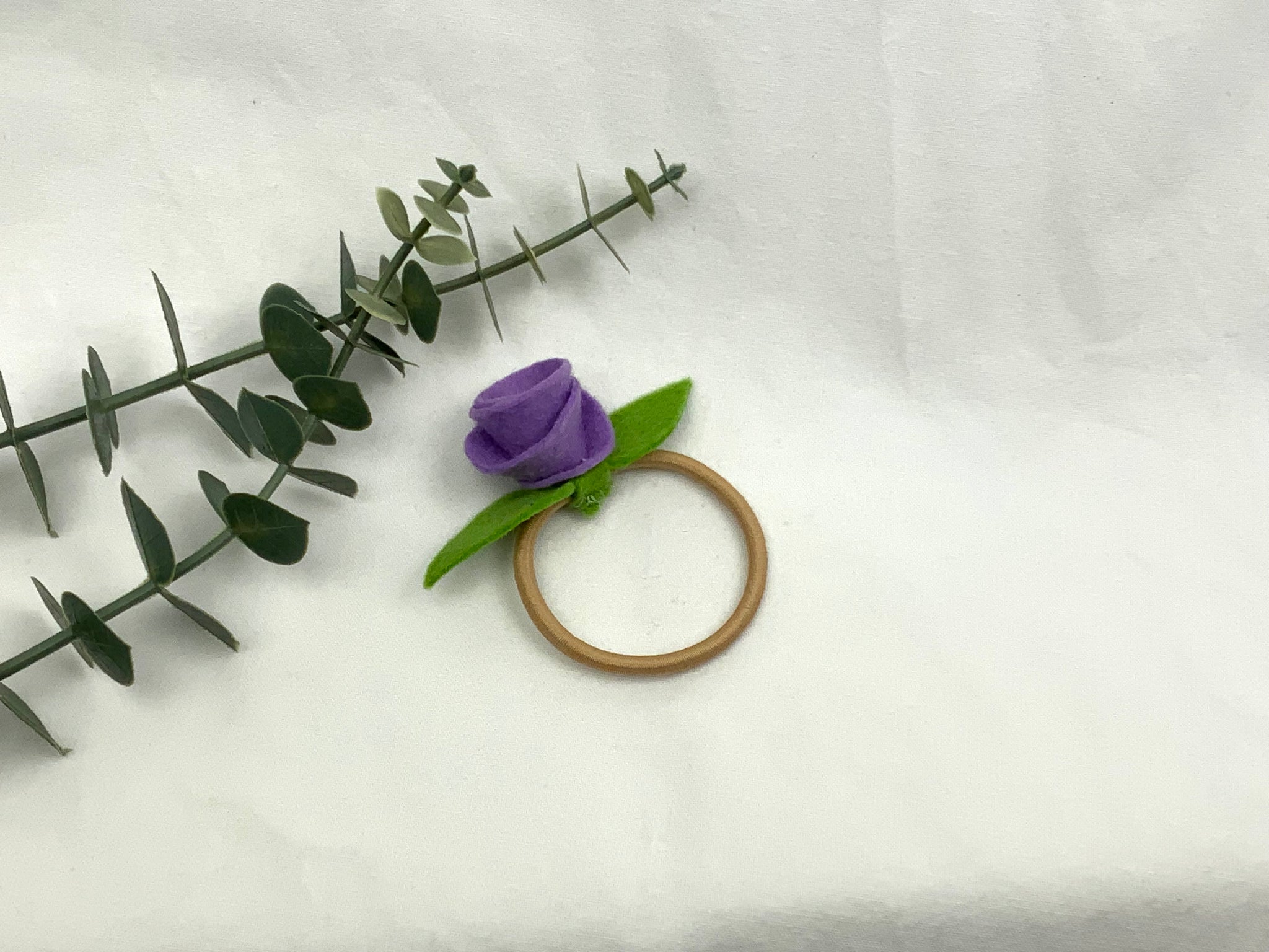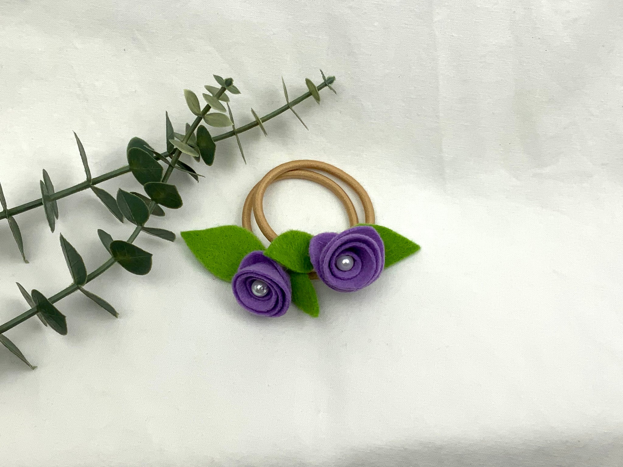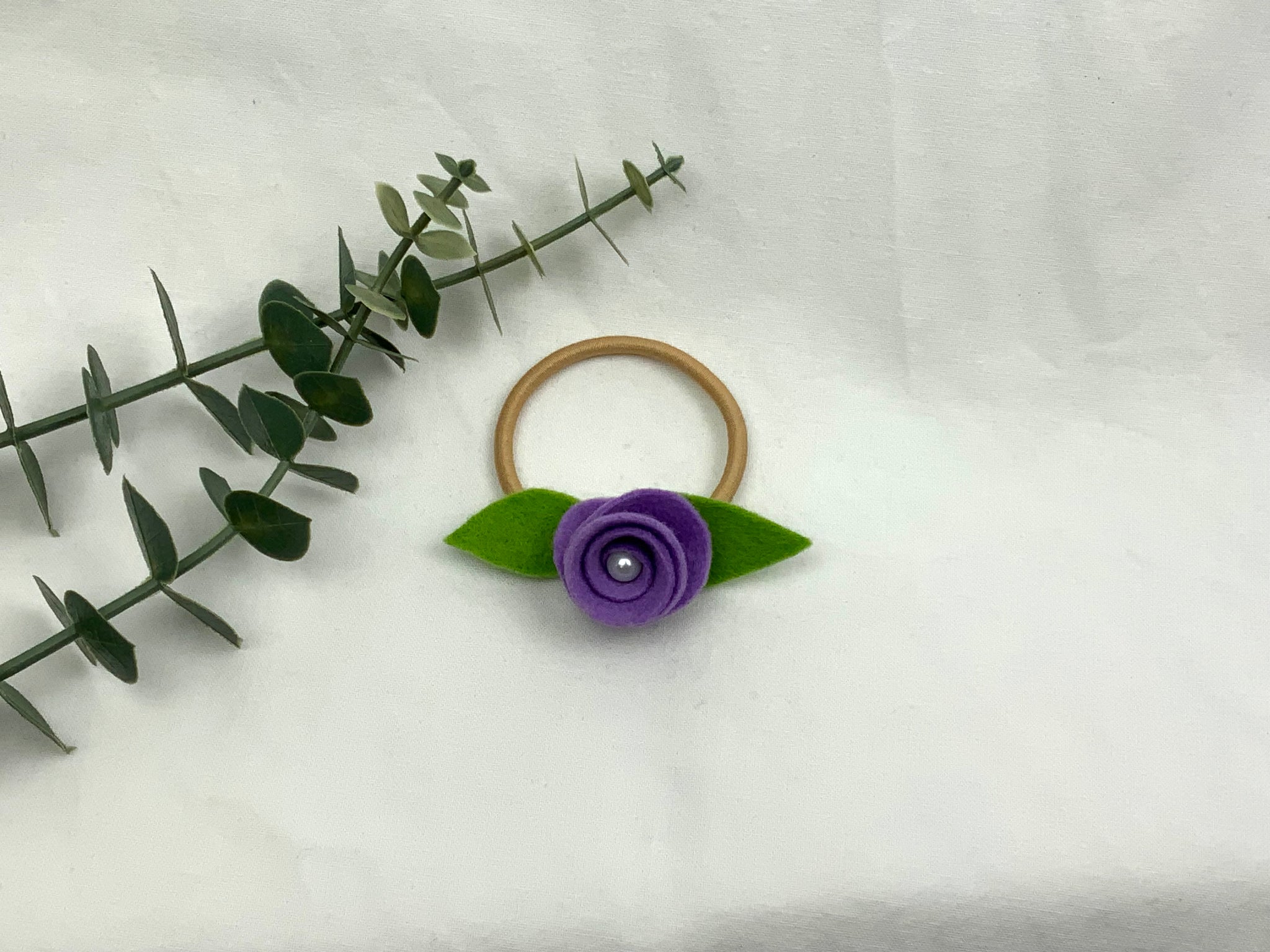 Handmade children's hair bands. Felt roses with a centre pearl bead, hand sewn onto the elastic. No glue used. Purple felt rose on a blonde elastic band. Best suited for lighter coloured hair.