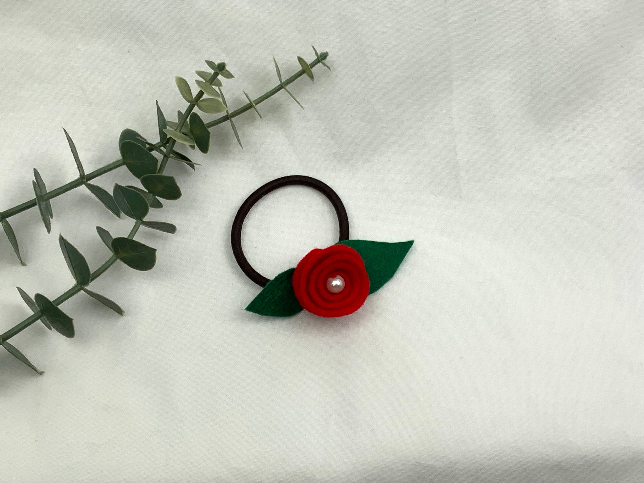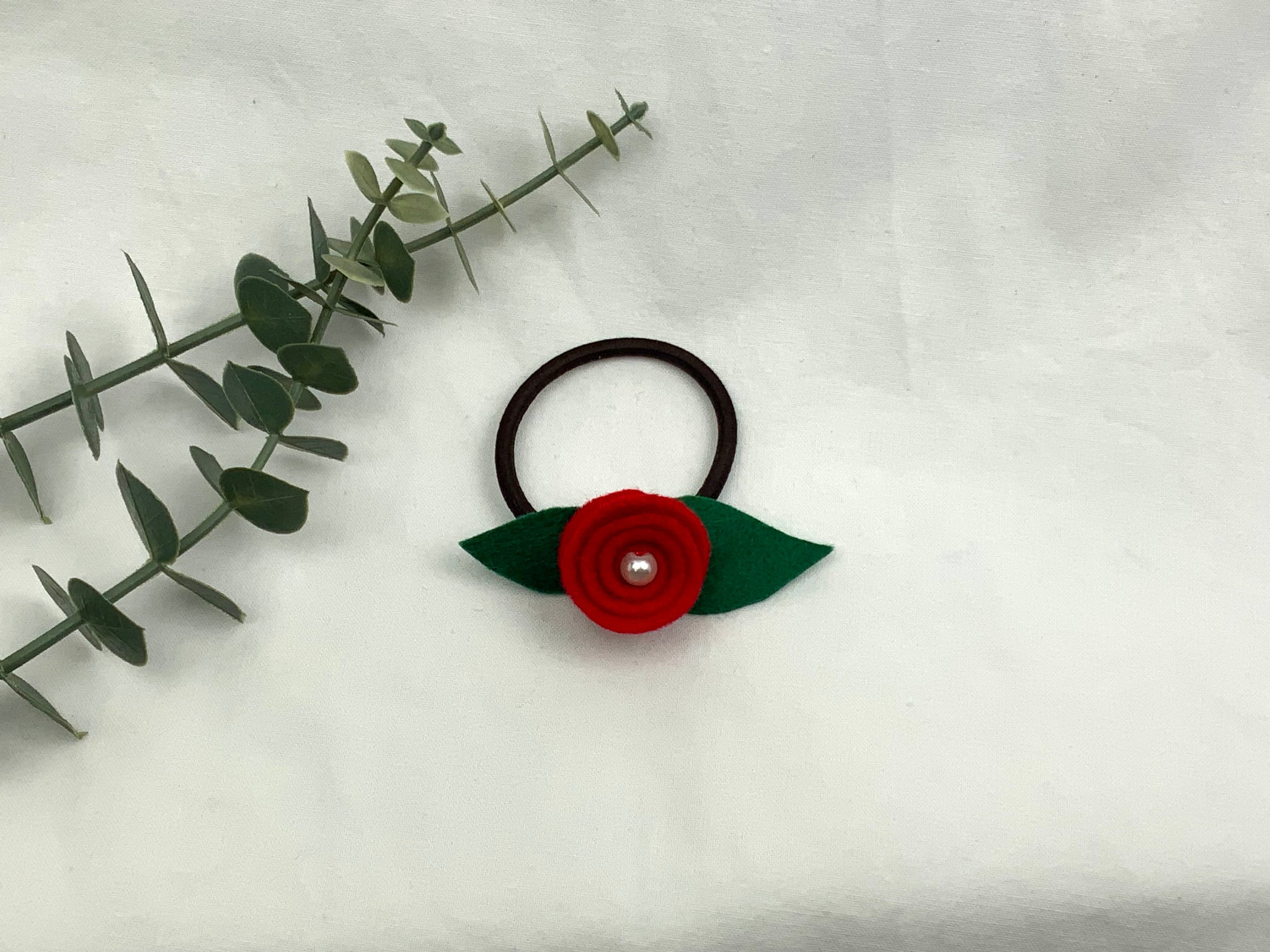 Handmade children's hair bands. Felt roses with a centre pearl bead, hand sewn onto the elastic. No glue used. Red felt rose on a brown elastic band. Best suited for darker coloured hair.