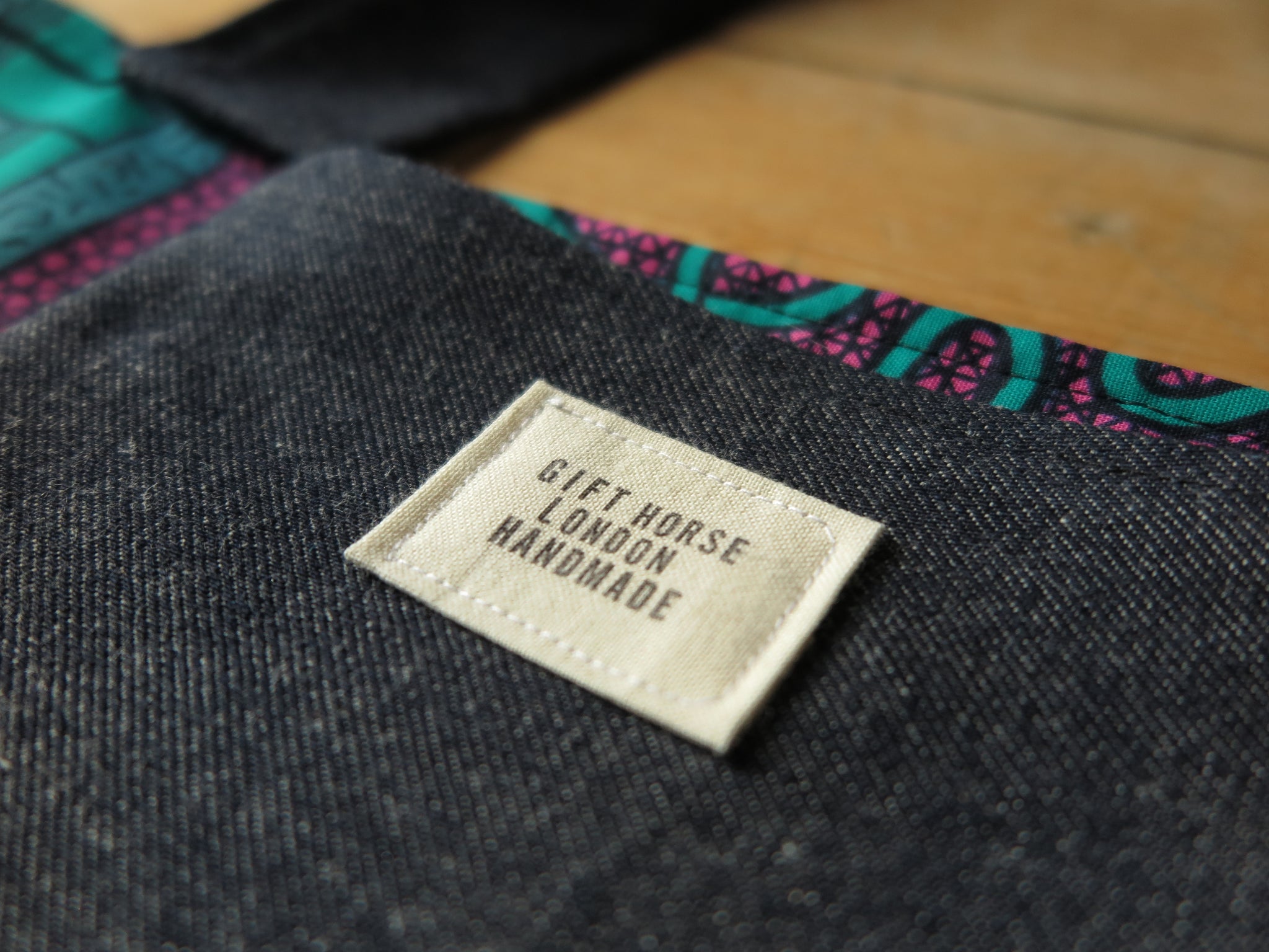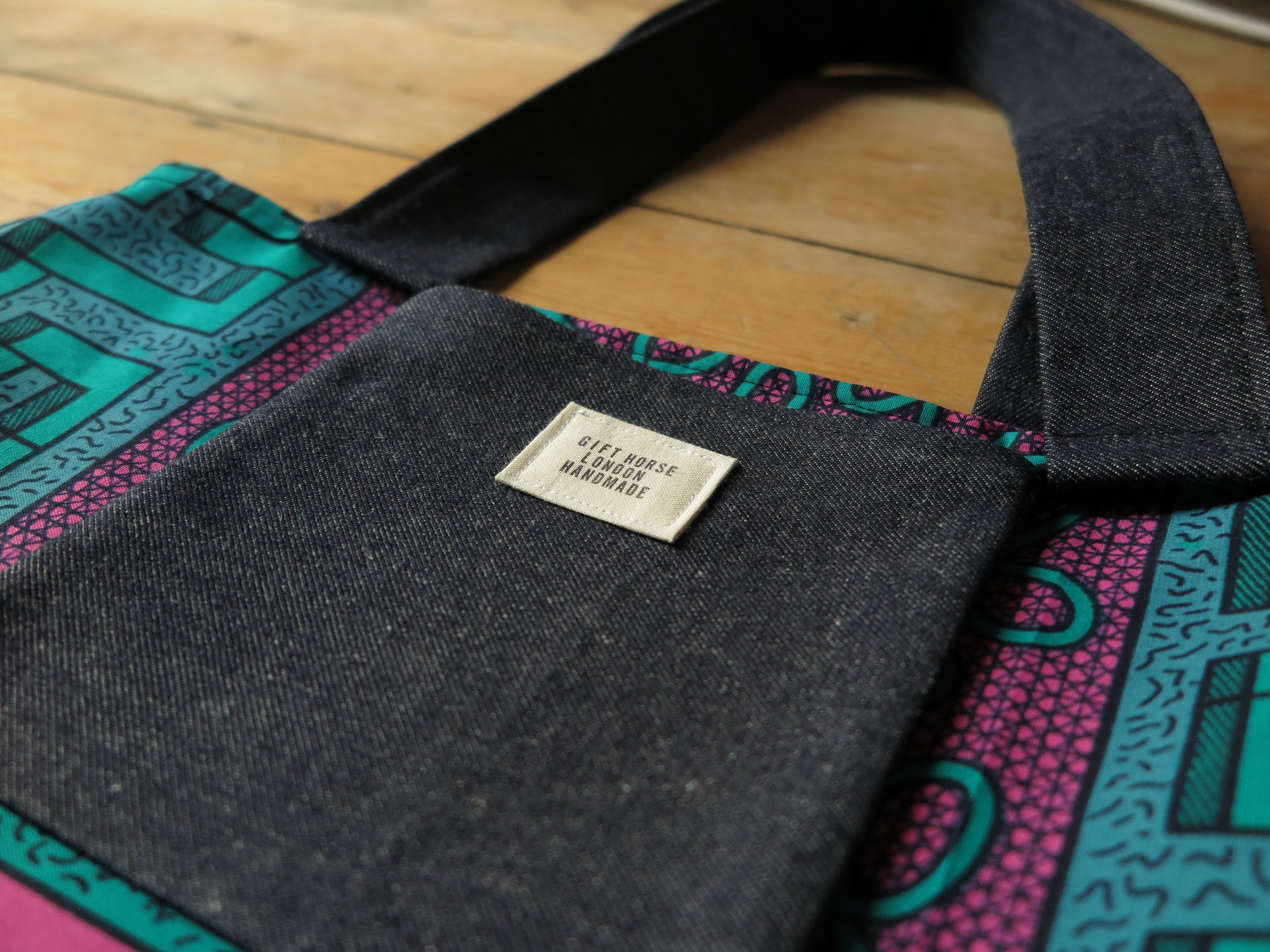 A stylish bag for everyday use. Constructed from a vibrant African print with hardwearing denim straps for added strength. The inside pocket is also made from denim.